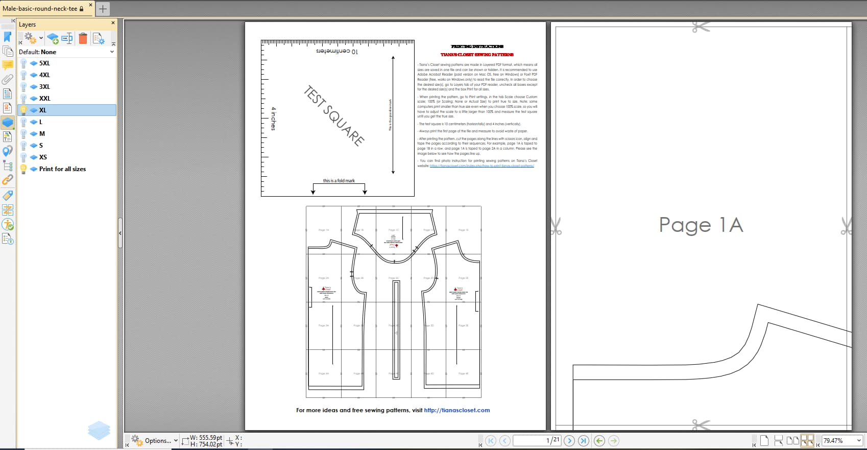 A szabásminta többrétegű PDF-en van, a megfelelő mérethez engedélyeztem a rétegeket és kinyomtattam a lapokat, a PDF-XChangeben nyomtatásnál a Fit to Printer Margins beállítással jó eredményt kaptam.